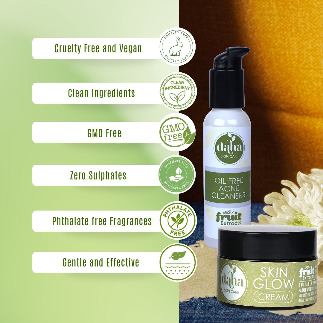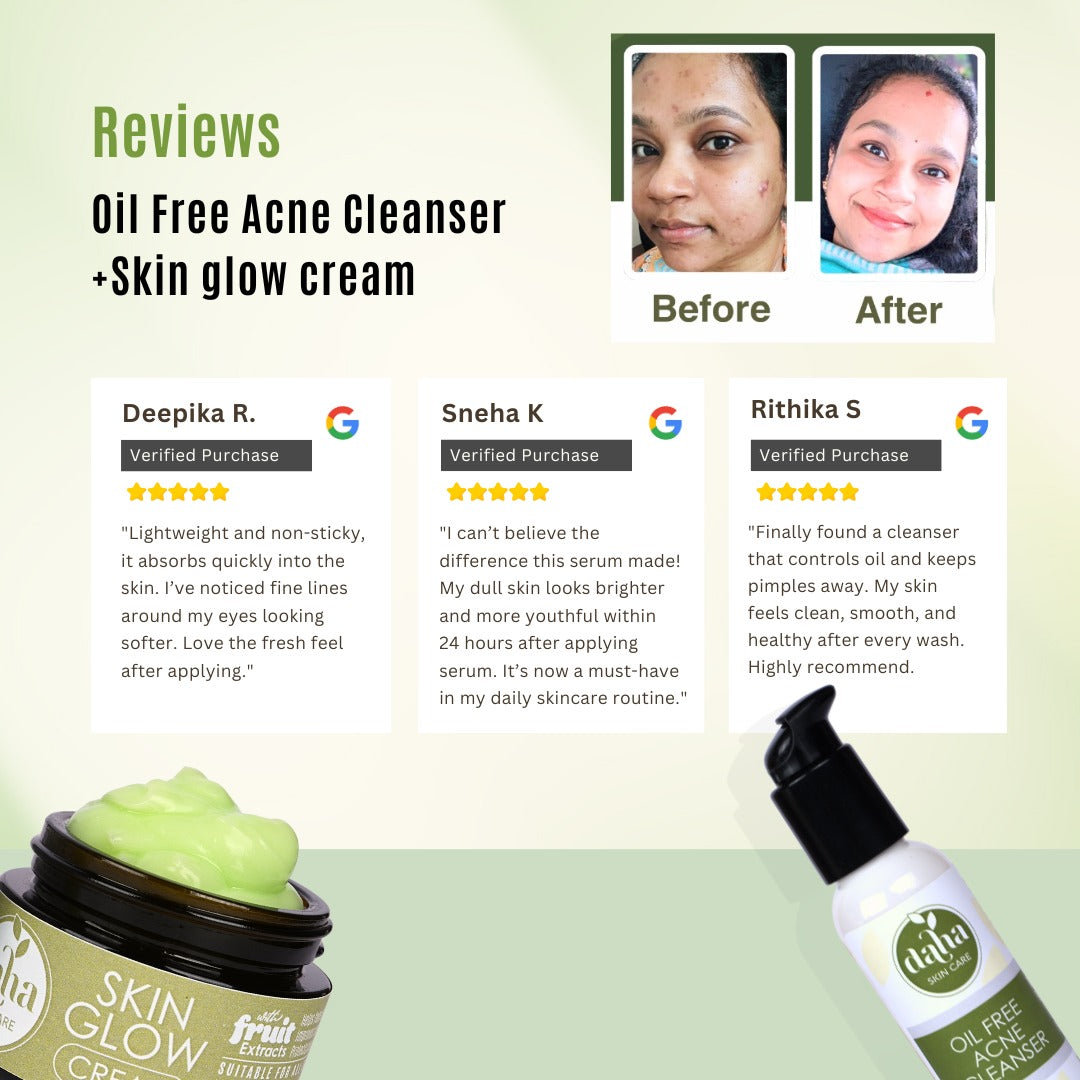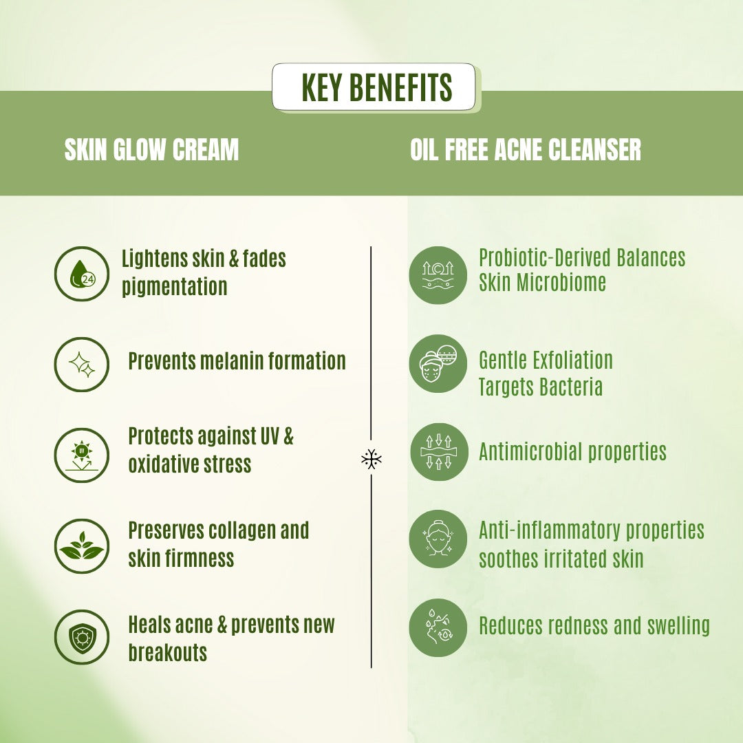This Acne Free Combo combines Oil Free Acne Cleanser (100ml) and Skin Glow Cream (30ml). It balances microbiome, reduces acne, prevents breakouts, lightens pigmentation, enhances radiance, and restores clear, even-toned skin.