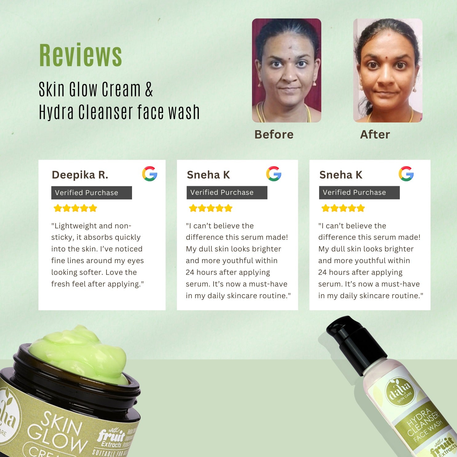 Hydra Cleanser Face Wash (100ml): A gentle daily cleanser enriched with fruit extracts that hydrates, calms sensitivity, and lifts away impurities without stripping your skin.