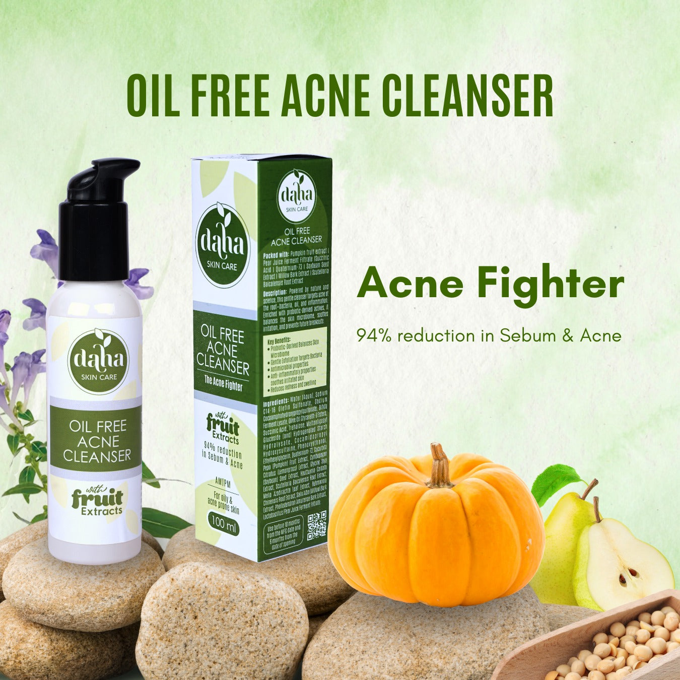 DAHA Oil Free Acne Cleanser targets acne at the root with botanical actives, balancing microbiome, reducing inflammation, and preventing breakouts. Leaves skin calm, clear, and smooth without excess oil or irritation.